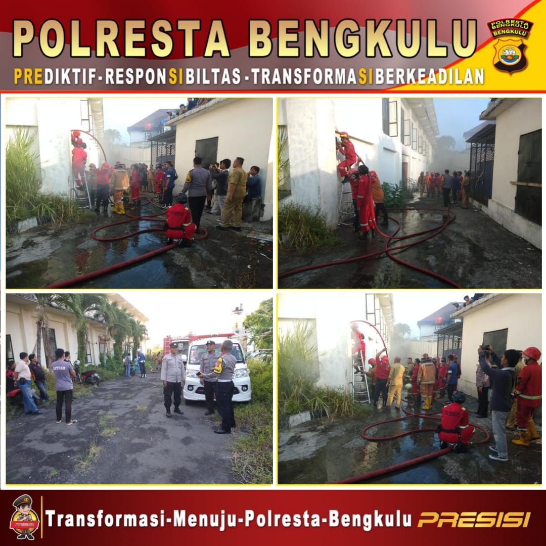Kota Bengkulu – Personel Polsek Ratu Samban Polresta Bengkulu Polda Bengkulu, melaksanakan pengamanan dan olah tempat kejadian perkara (TKP) kebakaran gedung Wisma Pemda di jalan Soekarno Hatta Kelurahan Anggut Atas Kota Bengkulu, Senin (12/06/2023).