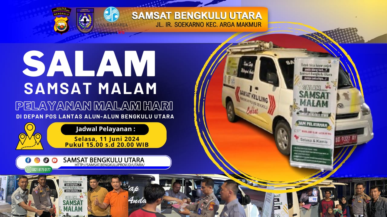 BENGKULU UTARA – Sat Lantas Polres Bengkulu Utara menghadirkan inovasi untuk memudahkan para wajib pajak kendaraan bermotor, inovasi tersebut yakni pembayaran pajak untuk kendaraan dapat dilakukan pada malam hari atau (Salam) Samsat Malam yang berlokasi di depan Pos Lantas Alun – Alun Kota Argamakmur Kabupaten Bengkulu Utara Selasa (11/6).