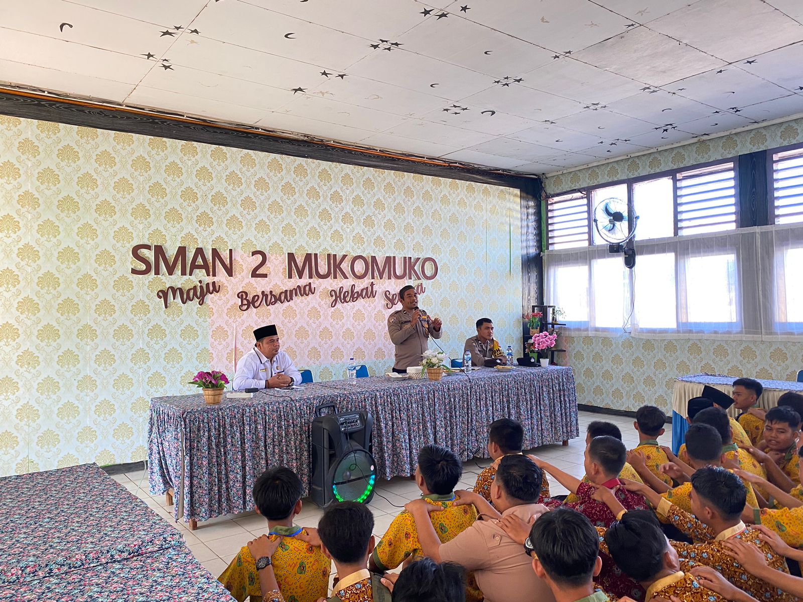 Kapolsek Mukomuko Selatan Iptu M. Setya Yuli M, S.H., melalui Kanit Binmas Aiptu G. B Siregar dan Bhabinkamtibmas Briptu Willi Denis melaksanakan penyuluhan tentang Bahaya Narkoba bagi pelajar SMAN 2 Mukomuko, Rabu (12/7/2023).