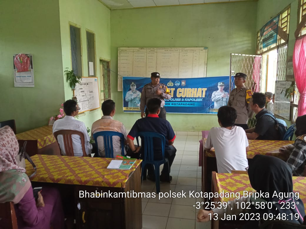 Bengkulu, Siberindo.co – Polsek Kotapadang Polda Bengkulu kembali menggelar Jumat Curhat. Jumat Curhat Kapolsek Kotapadang kali ini digelar di Kelurahan Kotapadang Kecamatan Kotapadang Kabupaten Rejang Lebong tepatnya di Kantor Lurah Kotapadang, Jumat (13/01/2023).