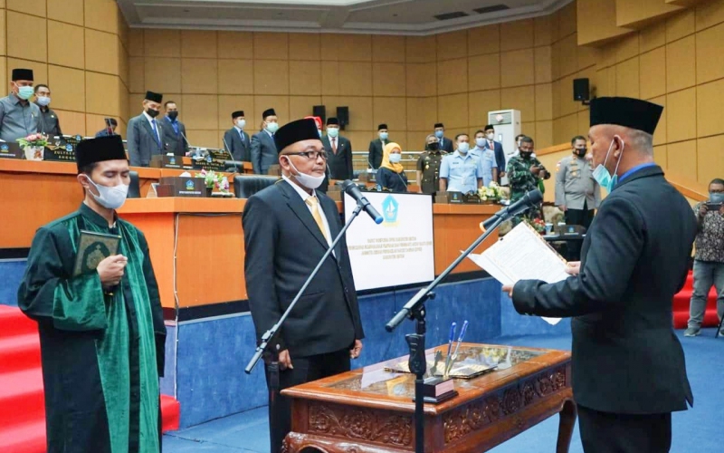 Ketua DPRD kabupaten Bintan Agus Wibowo melantik dan mengambil Sumpah dan janji pengganti antar waktu. ( PAW ) Suherianto sebagai Anggota DPRD kabupaten Bintan di gedung, Kamis (11/02/2021).