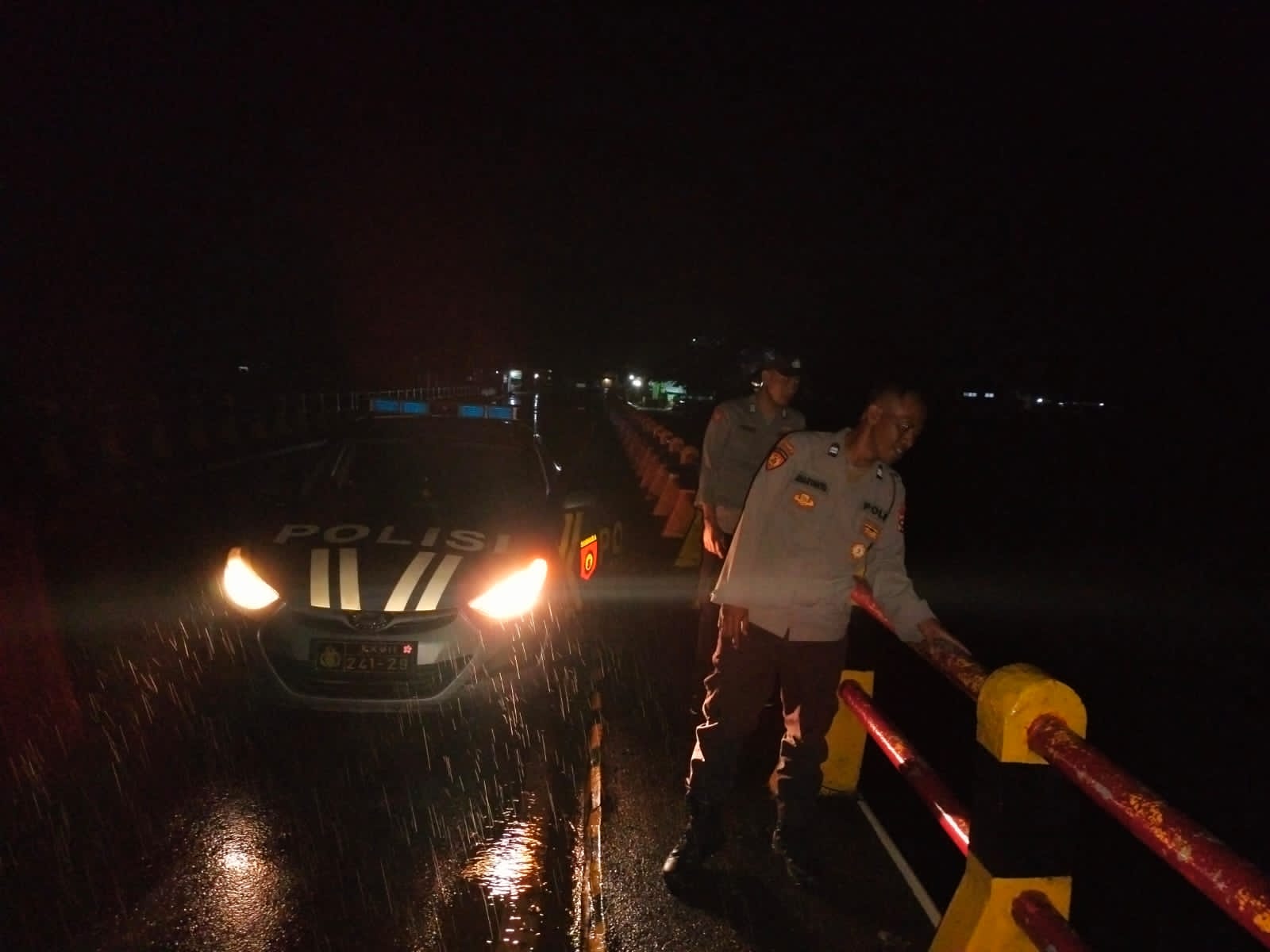 Personel patroli malam juga menghimbau pengemudi kendaraan untuk berhati-hati mengantisipasi jalan yang licin dan  berkurangnya jarak pandang akibat hujan deras.