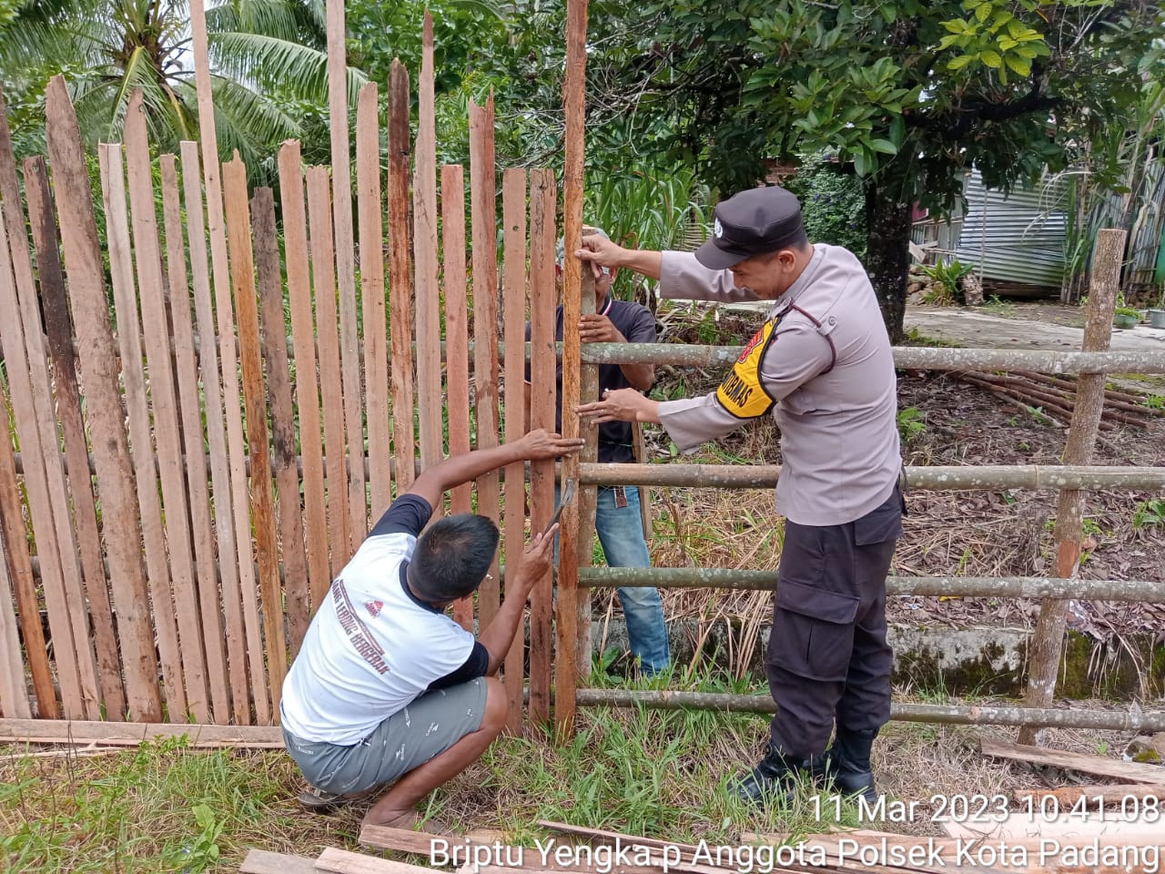 Jadi kemaren Briptu Yengka sedang malaksanakan sambaing ke desa Binaanya dan ada salah 1 warga binaanya yang sedang melaksanakan perbaikan Pagar Rumah,jadi dia Briptu Yengka langsung berinisiatif untuk membantu warganya tersebut, ujar Iptu Mansyur