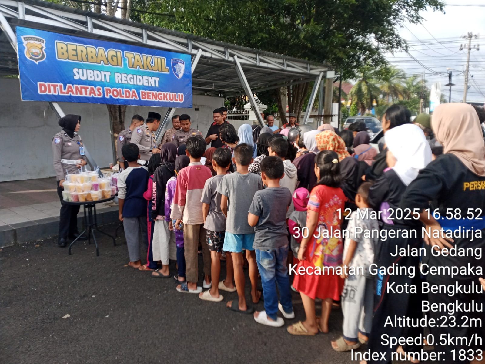 Bengkulu – Subdit Regident Ditlantas Polda Bengkulu yang dipimpin AKBP Riky Crisma Wardana, S.I.K., membagikan takjil kepada masyarakat. Takjil tersebut dibagikan kepada masyarakat disekitar Balai Buntar Kota Bengkulu, setiap sore hari dimulai pukul 17.00 WIB.
