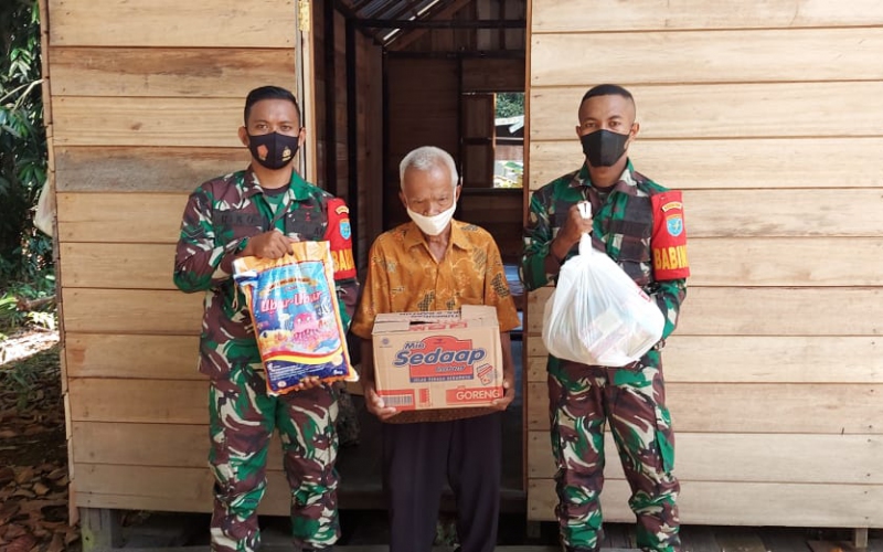 Anggota Koramil 1015-10/Kotabesi Serda Mardaya jaya dan Serda Riko melakukan bhakti sosial pembagian Sembako kepada warga terdampak pandemi Covid-19 dan kurang mampu di Desa Kandan Kecamatan Kotabesi,Kab.Kotawaringin Timur,Sabtu(12/06)