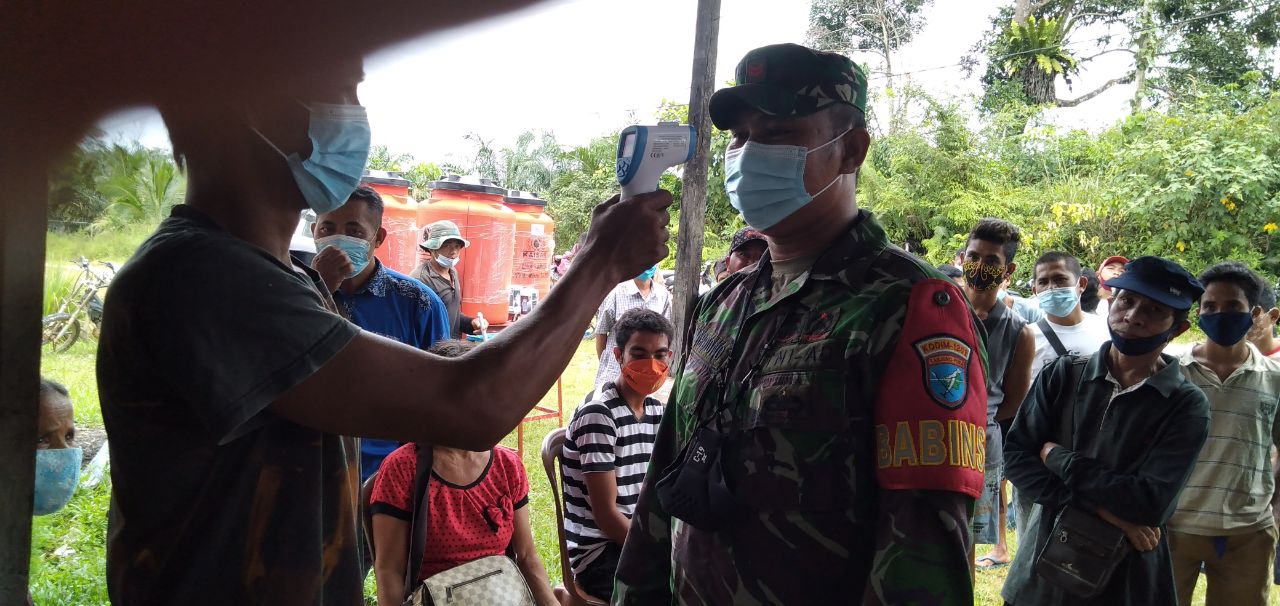 Landak – Dalam setiap kegiatannya, Babinsa Koramil 1201-11/Ngabang Koptu Wardiono, selalu memberikan contoh upaya mencegah dan menangani Covid-19 dengan pemeriksaan suhu tubuh kepada warga binaannya di Desa Amang, Kecamatan Ngabang, Kabupaten Landak.
