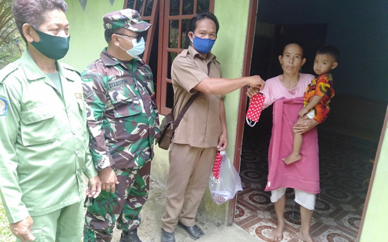 Babinsa Koramil 1201-08/Mandor, Serda Syamsuddin bersama perangkat Desa Kerohok membagikan masker secara gratis kepada warga Desa Kerohok Kecamatan Mandor Kabupaten Landak, Kamis (10/6/2021).