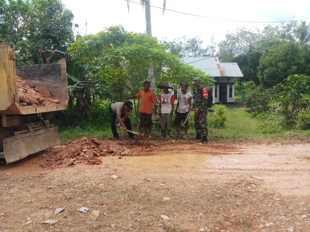 Mempawah – Babinsa Koramil Sungai Pinyuh, Serda Budi santosa, bersama masyarakat melaksanakan karya bakti memperbaiki jalan berlubang di Desa Rasau, Kecamatan Sungai Pinyuh, Kabupaten Mempawah, Sabtu (12/6/2021)