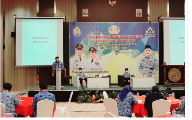 Pemerintah Kabupaten Kendal menggelar Rapat Kerja Daerah KORPRI Kabupaten Kendal Tahun 2021 yang mengangkat tema “SDM ASN yang Unggul dan Adaptif Berbasis Kompetensi”, Jumat (11/06/2021) bertempat di Aula Hotel Haris Semarang.