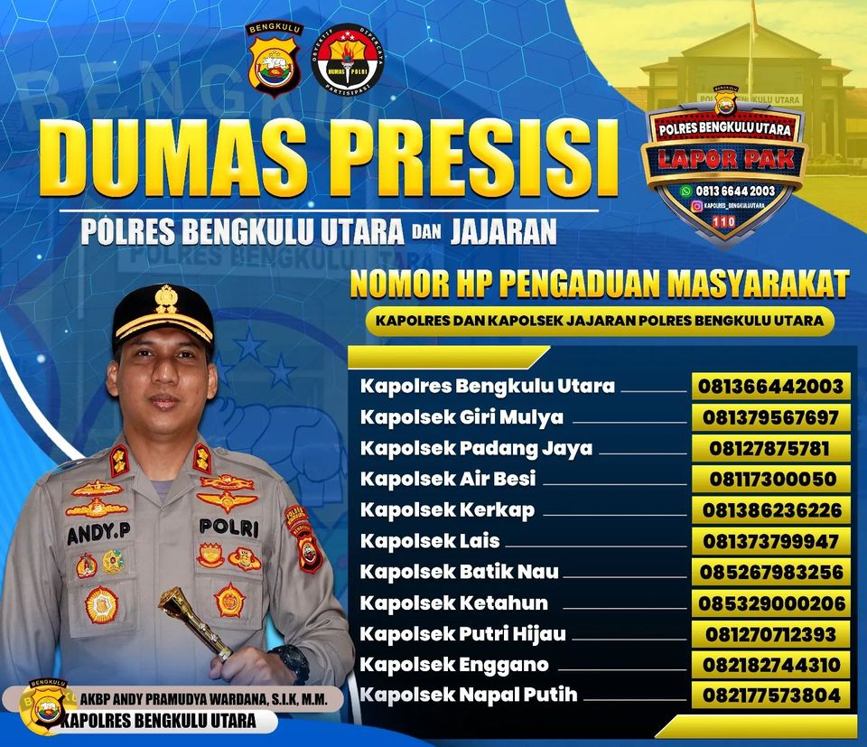 Bengkulu Utara – Dalam rangka menciptakan Sitkamtibmas yang kondusif dan untuk mendapatkan informasi dari masyarakat sekecil apapun, Polres Bengkulu Utara Polda Bengkulu merilis Nomor Hp Pengaduan Masyarakat (Dumas) Presisi Polres Bengkulu Utara dan Polsek Jajaran.