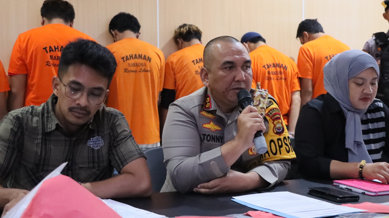 Kapolres Rejang Lebong AKBP Tonny Kurniawan, S.I.K., didampingi Kasatres Narkoba Iptu Cahya Prasada Tuhuteru dan Kasi Humas Iptu Bertha Ginting dalam press releasenya, Rabu (12/10/2022) menjelaskan, terduga pelaku penyalahgunaan Narkoba tersebut diamankan setelah dilakukan penyelidikan berdasarkan informasi dari masyarakat.