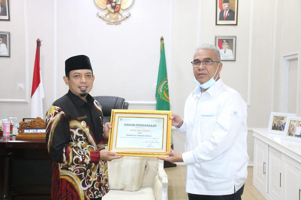 Kementerian Keuangan melalui Kepala Kanwil Ditjen Perbendaharaan Provinsi Bengkulu Ismed Saputra menyerahkan langsung penghargaan kepada Plt Wali Kota Dedy Wahyudi di ruang kerja Wali Kota, Kamis (12/11/2020).