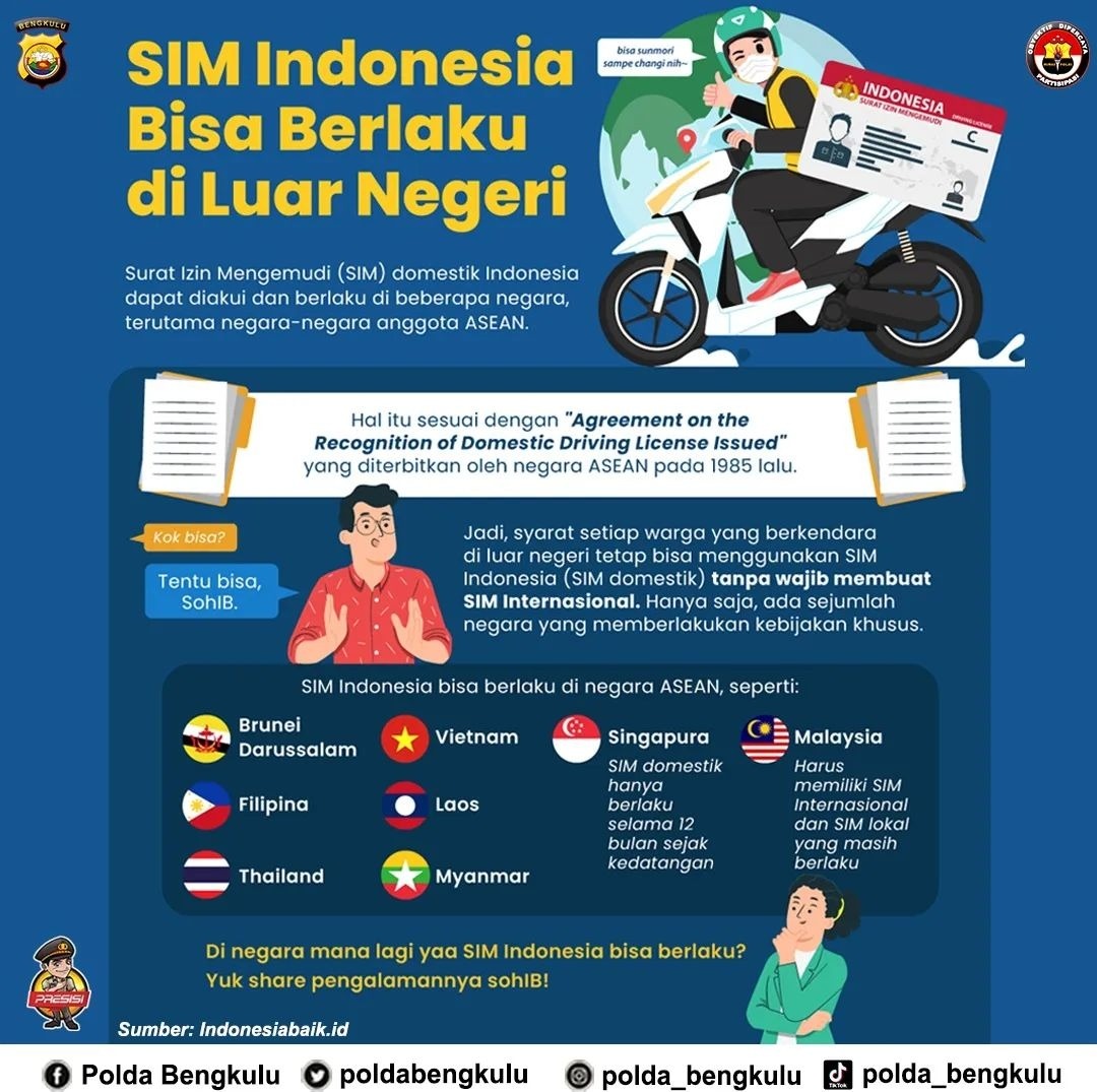 Bengkulu, Siberindo.co – Hai Sobat Polri, Surat Izin Mengemudi (SIM) domestik Indonesia dapat diakui dan berlaku di beberapa negara, terutama negara-negara anggota ASEAN.