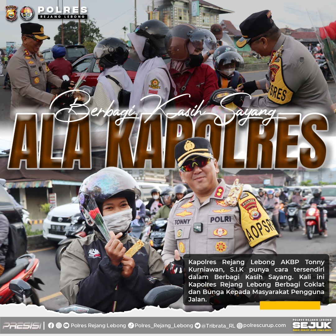 Kapolres Rejang Lebong AKBP Tonny Kurniawan didampingi Kasat Lantas Iptu Melisa mengatakan, selain membagikan coklat dan bunga, petugas juga menyampaikan imbauan tertib berlalu lintas.