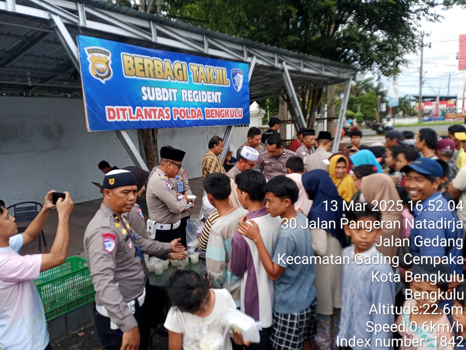 Bengkulu – Subdit Regident Ditlantas Polda Bengkulu, kembali berbagi takjil kepada masyarakat. Kegiatan tersebut dipusatkan di Balai Buntar Kota Bengkulu, Kamis (13/3/2025).
