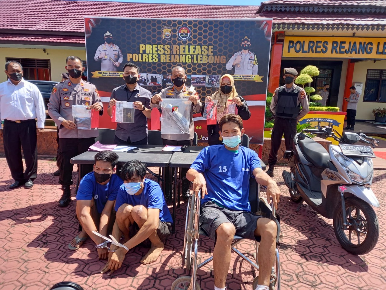 Menurut Kapolres Rejang Lebong, AKBP Tonny Kurniawan, S.Ik dalam jumpa pers di halaman Mapolres Rejang Lebong Kamis (14/4/2022), keduanya melakukan pencurian pada hari Selasa (5/4/2022) April 2022 dini hari. Saat itu korban baru mengetahui menjadi korban pencurian saat terbangun mau makan sahur jam 01.30 WIB. Korban mendapati pintu rolling rumahnya dalam keadaan terbuka sehingga korban mengecek isi rumah dan mendapati sepeda motor Kawasaki KLX dengan nomor polisi BG 6288 HAA dan modem wifi merk PTP Link sudah tidak ada lagi.