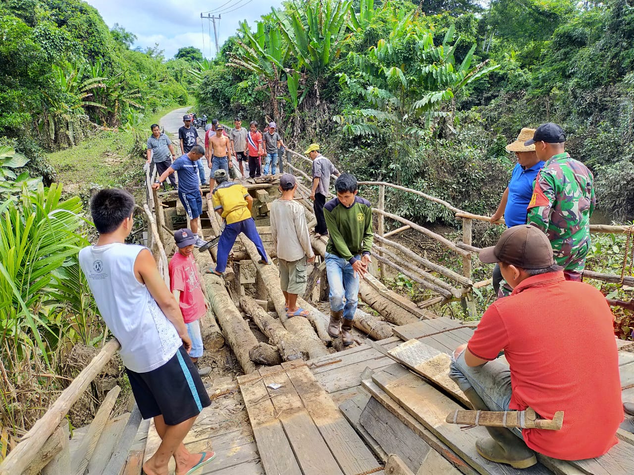 “Jembatan ini sudah lapuk dan tidak layak lagi. Babinsa bersama warga bergotong royong memperbaikinya dengan material yang baru agar dapat dilewati warga,”Ujarnya.