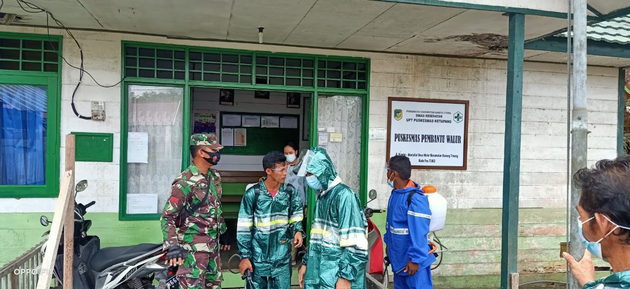 Babinsa Koramil 1013-09/Tumbang Laung melaksanakan pendampingan Penyemprotan Disinfektan Upt Puskesmas dalam rangka pencegahan penyebaran Covid-19 di Desa Laung