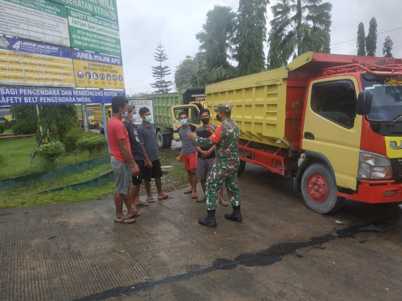 Koramil 1014-05/P.Banteng Babinsa Praka Toni melaksanakan komunikasi sosial (Komsos) untuk mendekatkan diri supaya terjalin hubungan kekeluargaan dan kebersamaan dengan Sopir Truk di Desa S.Pulo, Kecamatan Pangkalan Banteng, Minggu (13/06/2021).