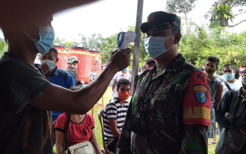 Dalam setiap kegiatannya, Babinsa Koramil 1201-11/Ngabang Koptu Wardiono, selalu memberikan contoh upaya mencegah dan menangani Covid-19 dengan pemeriksaan suhu tubuh kepada warga binaannya di Desa Amang, Kecamatan Ngabang, Kabupaten Landak.