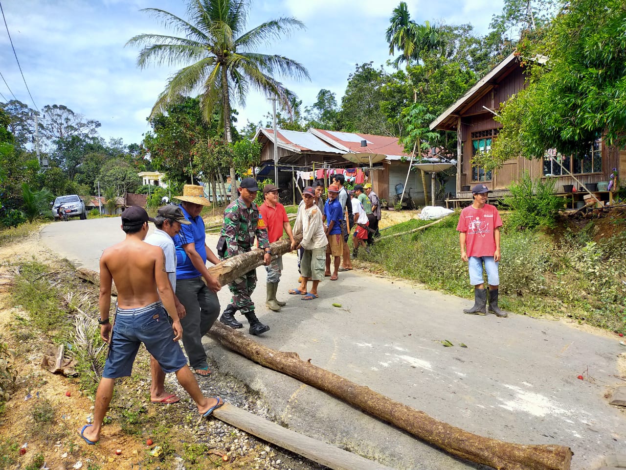 Nampak Babinsa Koramil 1013-01/Kandui Praka Eko wahyudi yang membantu masyarakat setempat untuk memindahkan beberapa batang kayu di Desa Balitu.