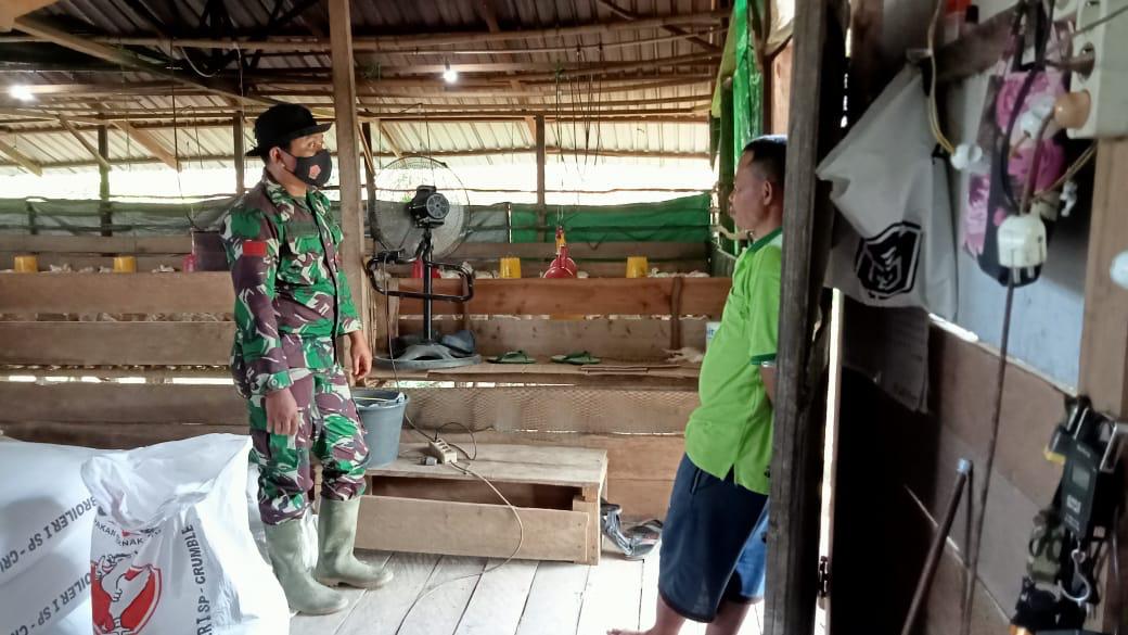 Babinsa Koramil 1014-05/P.Banteng Kodim 1014/Pbn Praka Imam melaksanakan komunikasi sosial dan pendampingan dengan membantu petani Ayam Memberi Pakan pada Ayam milik Bapak Witto di Desa Kebun Agung Kecamatan Pangkalan Banteng, Minggu (13/06/2021).