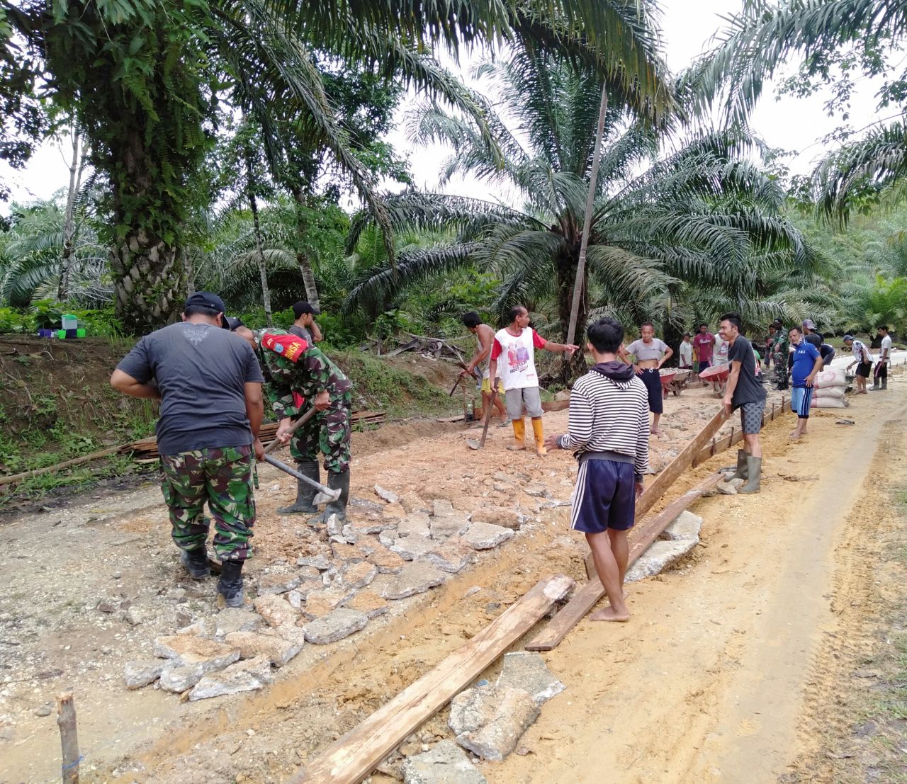 Landak – Personil Koramil Ngabang bersama masyarakat bergotong royong memperbaiki jalan poros di Dusun Pesayangan, Desa Raja, Kecamatan Ngabang, Kabupaten Landak, Minggu (13/6/2021).