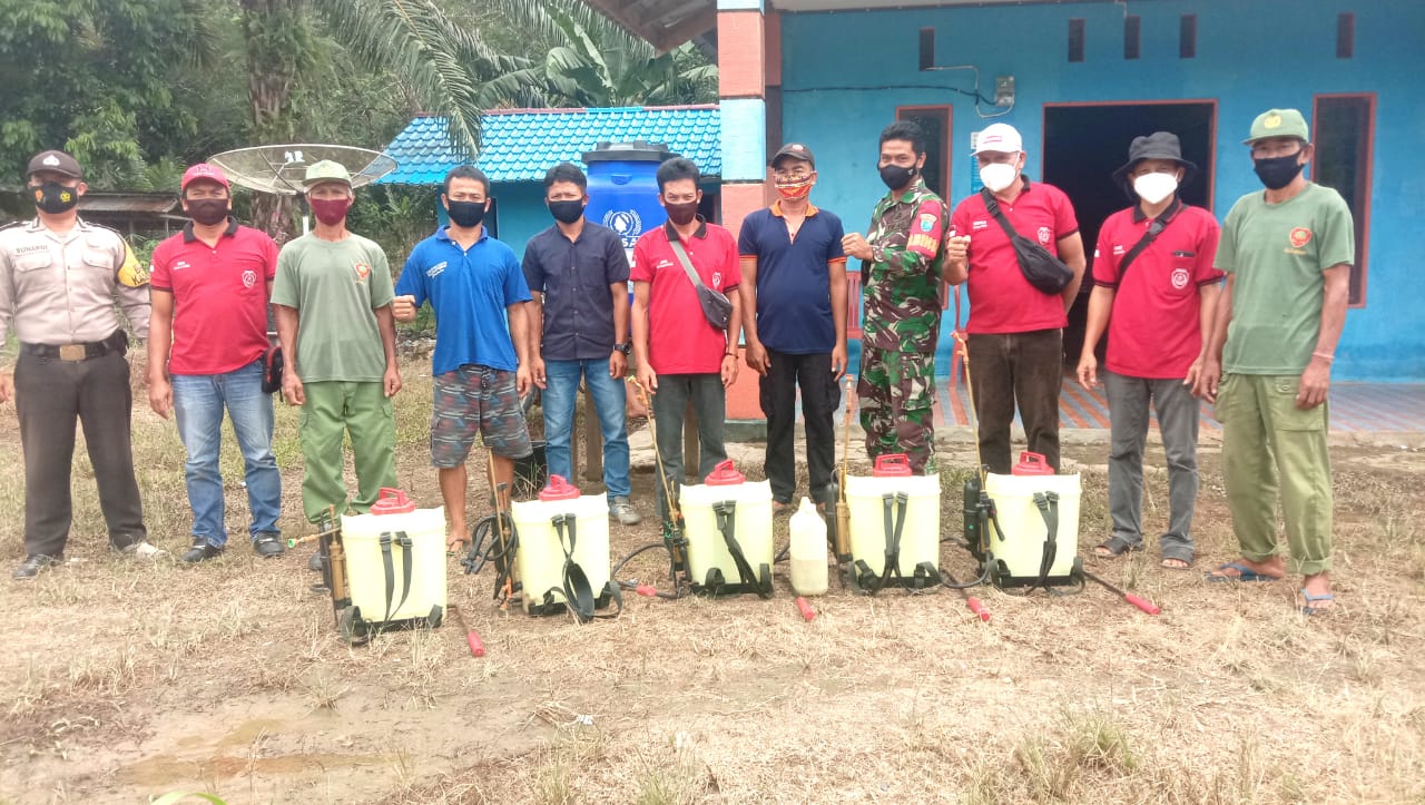 Landak – Babinsa Koramil 12/Air Besar, Serda Masnar bersama Bhabinkamtibmas, Bripka Sunardi melakukan penyemprotan disinfektan di sekitar perumahan dan tempat ibadah di Desa Jambu Tembawang, Kecamatan Air Besar, Kabupaten Landak, Minggu (13/6/2021).