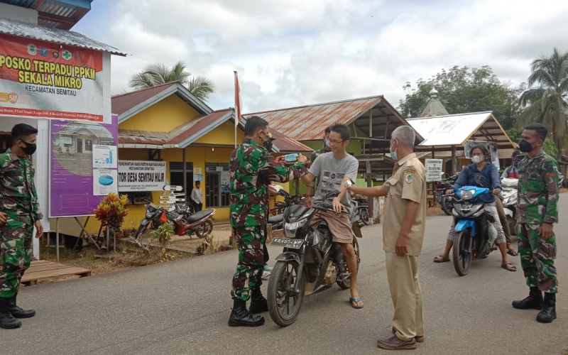 “Saat ini kasus penularan Covid-19 belum menunjukan tanda tanda penurunan malah semakin melonjak. untuk menuntut kewaspadaan kita semua, saya harap bapak ibu patut jaga diri, salah satunya dengan menggunakan masker saat beraktifitas di luar rumah”, Ucap PJ Danramil 1206-12/Manday Pelda Mulyono.