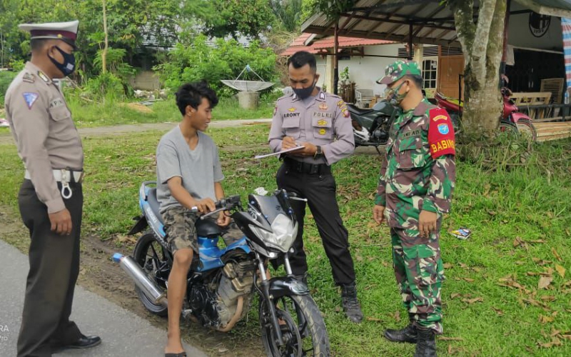 Babinsa Koramil 1201-06/Menjalin Sertu Sapardi menyambangi wilayah binaannya guna menyosialisasikan Pemberlakukan Pembatasan Kegiatan Masyarakat (PPKM) skala Mikro dan membagikan masker di Desa