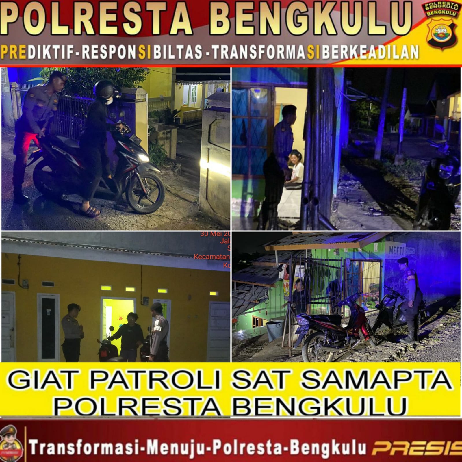 Kegiatan ini juga salah satu upaya untuk menciptakan situasi Kamtibmas yang aman kondusif khususnya di wilayah hukum Polresta Bengkulu, terutama pada malam hari yang mana merupakan waktu yang rawan terjadinya gangguan Kamtibmas.
