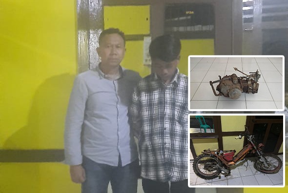 Adapun, selain menangkap terduga pelaku, petugas juga mengamankan barang bukti 1 unit kerangka mesin sepeda motor, 1 unit mesin sepeda motor, 1 buah BPKB sepeda motor Suzuki Shogun.