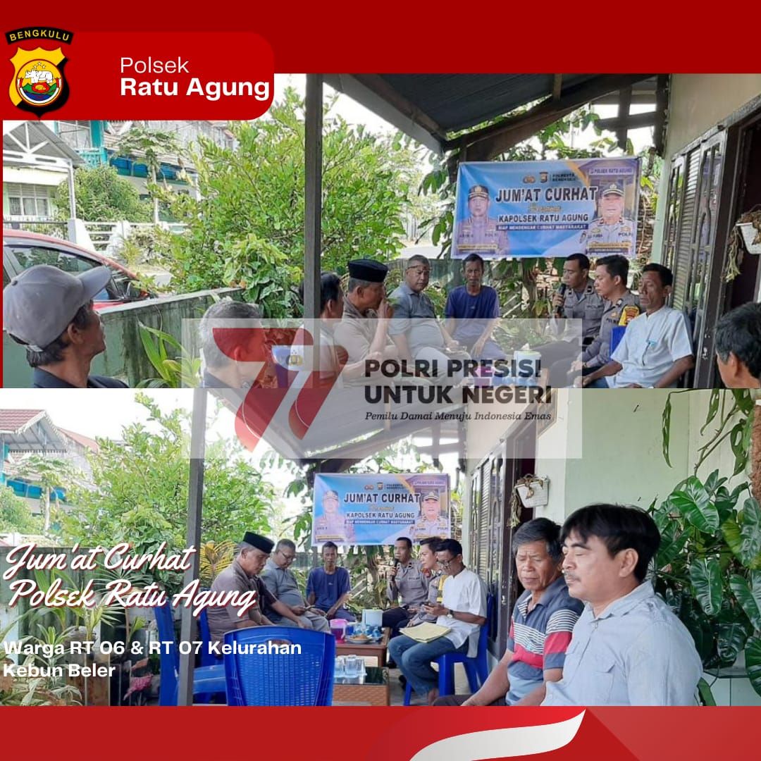 Menindak lanjuti program Kapolri tersebut, kali ini Polsek Ratu Agung Polresta Bengkulu Polda Bengkulu, menggelar Jumat Curhat dengan warga Kelurahan Kebun Beler Kecamatan Ratu Agung Kota Bengkulu, Jumat (14/07/23).