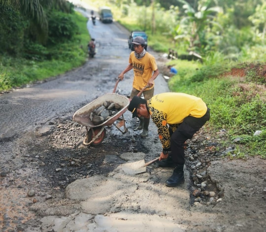 Kapolsek Padang Jaya bersama anggota saat melaksanakan tugas patroli melihat warga yang sedang bergotong royong memperbaiki jalan yang rusak.