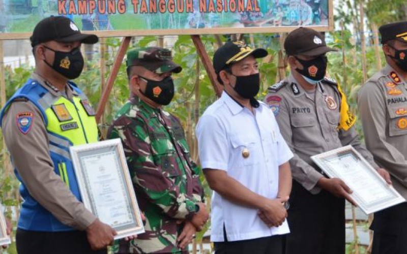 Di akhir acara, Dedy beserta Kapolres dan Dandim membagikan piagam penghargaan kepada petugas bhabinkamtibmas dan babinsa sebagai pelopor kampung tangguh