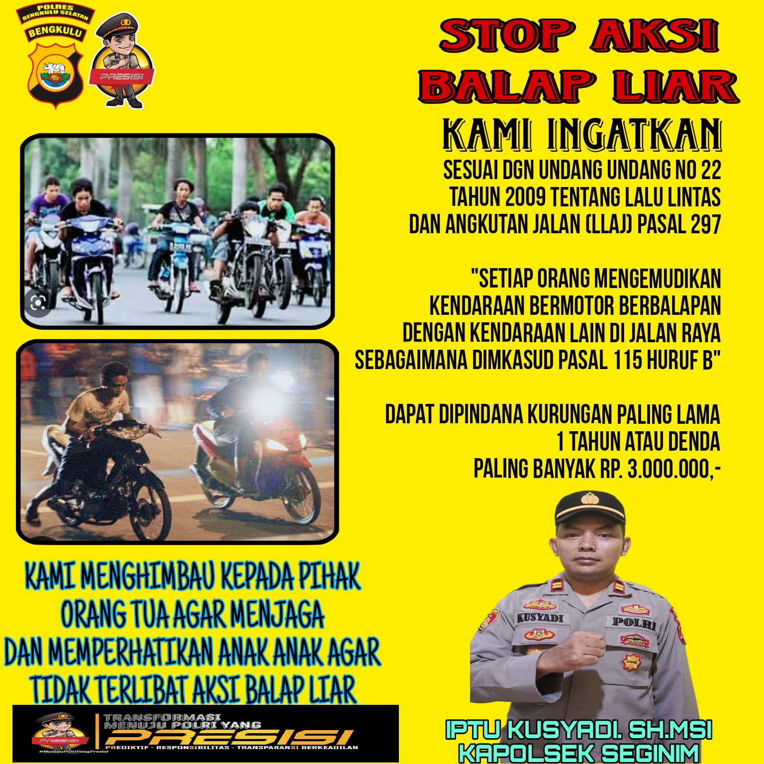 Kegiatan imbauan tersebut di laksanakan oleh Kapolsek Seginim dan personel dengan mengingatkan kepada warga masyarakat / orang tua dan para pemuda akan pentingnya mentaati rambu-rambu lalu lintas guna meminimalisir terjadinya kecelakaan pada saat berkendara di jalan raya dan larangan melakukan balap liar.
