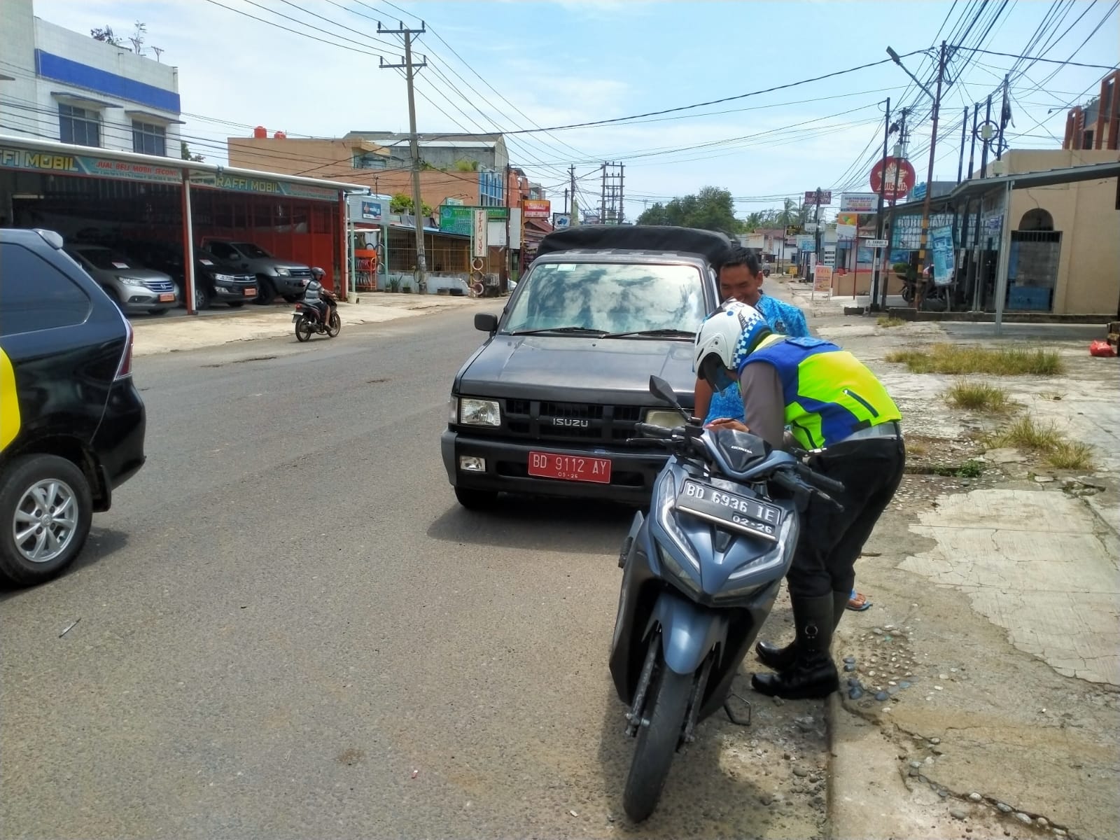 Terlihat personel memberhentikan kendaran dengan muatan Barang Over Dimensi Over Loading (ODOL) di Jl lingkungan Pasar Panorama (Jl Salak Raya ), Kecamatan Singaran Pati, Kota Bengkulu yaitu 1 unit mobil Isuzu Panther ber plat merah.
