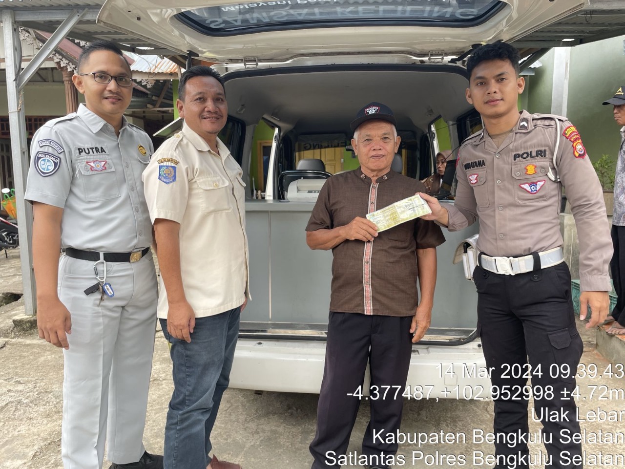Bengkulu Selatan -Personil Polres Bengkulu Selatan, Sat Lantas Polres Bengkulu Selatan Polda Bengkulu Bripda wiratama luke.F, dan petugas Jasa Raharja serta UPTD Samsat lainya melaksanakan pelayanan Samsat keliling di Kecamatan Pino Kabupaten Bengkulu Selatan, pada Kamis (14/03/24).