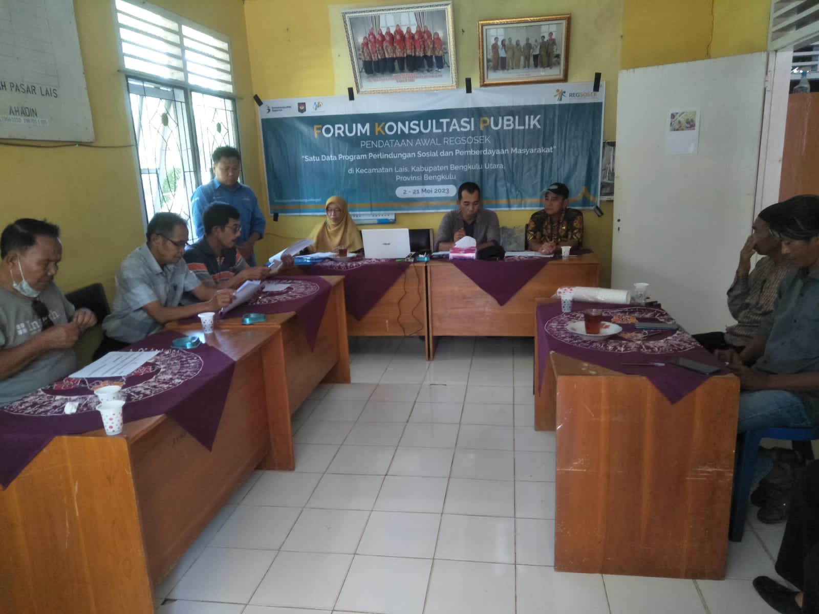 Acara Forum Konsultasi Publik ini dilaksanakan di Kelurahan Padar Lais kecamtan Lais kabupaten Bengkulu Utara dan bertujuan untuk memverifikasi Registrasi Sosial Ekonomi (Regsosek) seluruh warga kelurahan Pasar Lais dan pendataan ini dilakukan oleh Badan Pusat Statistik kabupaten Bengkulu Utara.