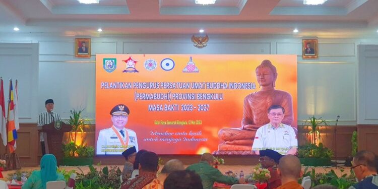 SIBERINDO.CO– Pengurus Daerah Persatuan Umat Buddha Indonesia (PERMABUDHI) Provinsi Bengkulu masa bakti 2023-2027 mengucapkan janji kepengurusan yang dipandu oleh Ketua PP PERMABUDHI Romo Citra Surya, SE.,ME di Gedung Daerah Balai Raya Semarak, Jumat (12/5).