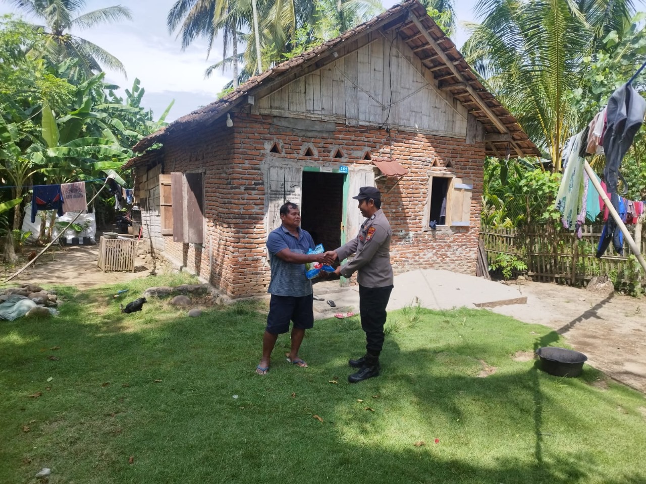 “Pemberian bantuan sembako berupa Beras 5 Kg, minyak goreng dan telur, kali ini kita serahkan ke Wahid (63) warga Desa Suka Menanti” jelas KKapolsek.