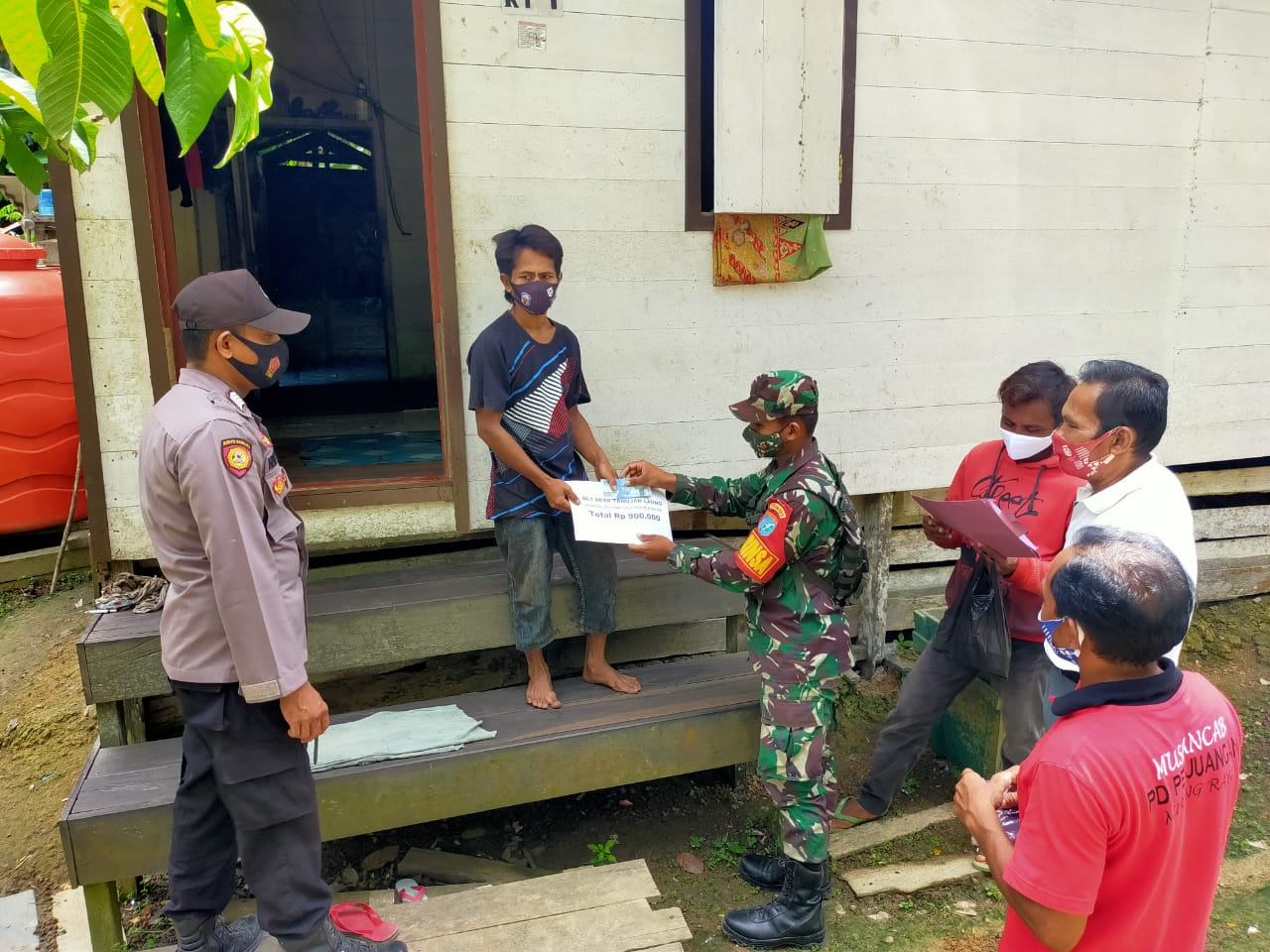 BARITO UTARA – Anggota Koramil 1013-02/Montallat Jajaran Kodim 1013/Mtw, Serda Edy Susanto melakukan bhakti sosial pembagian Bantuan kepada warga terdampak pandemi Covid-19 di Desa Pepas Kecamatan Montallat Kabupaten
