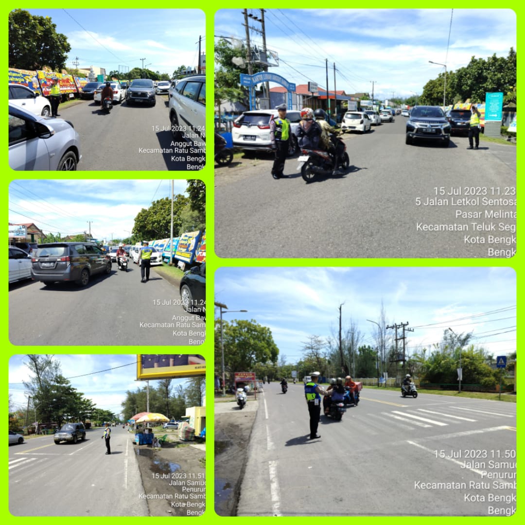 Bengkulu – Sat Lantas Polresta melakukan pengaturan lalu lintas daerah rawan macet dan laka di Jalan Pariwisata Pantai Panjang. Sabtu, (15/07/2023).