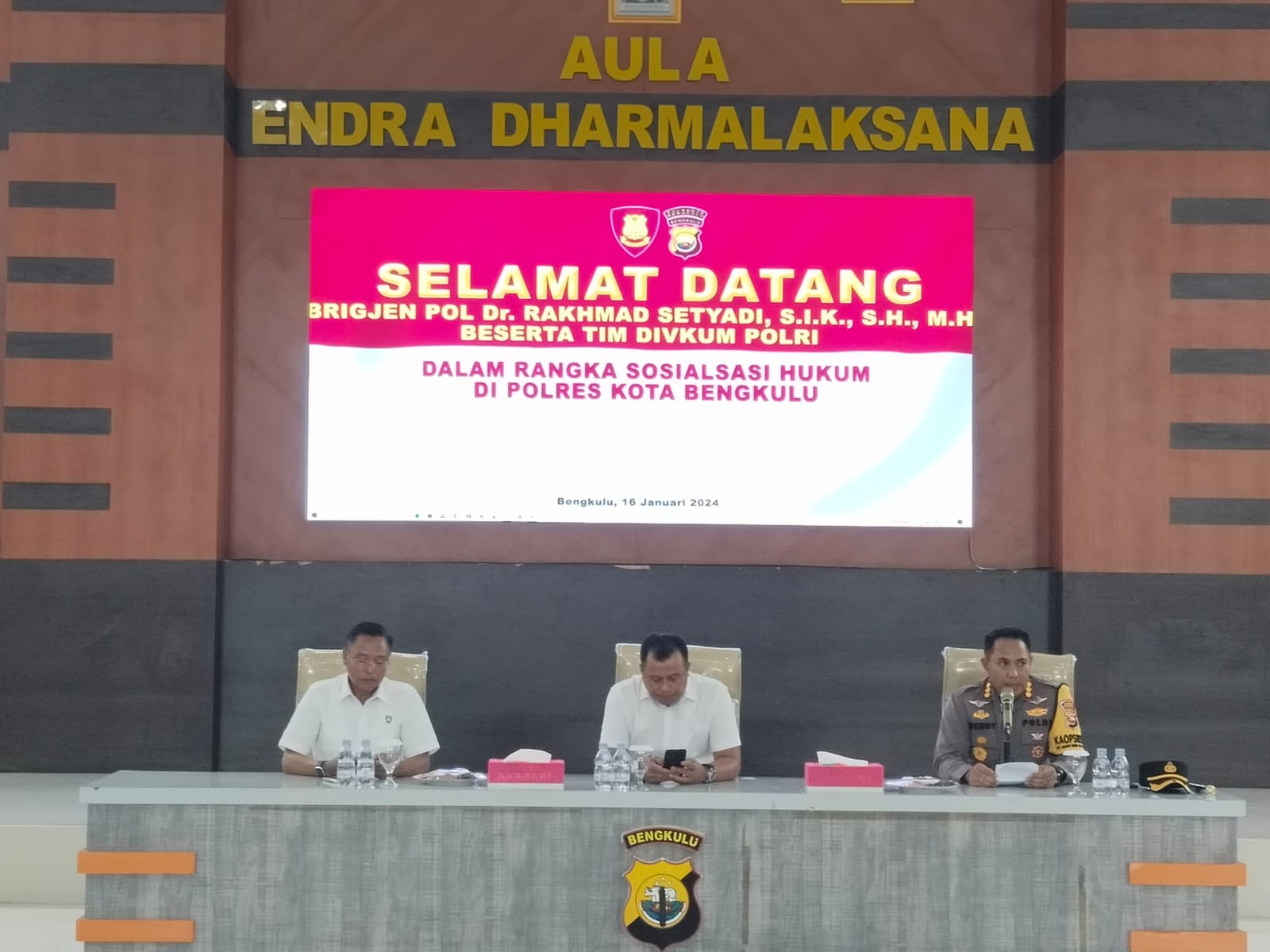 Bengkulu – Polresta Bengkulu Polda Bengkulu pada Selasa (16/1/2024), bertempat di aula Polresta Bengkulu, menerima kunjungan dari Mabes Polri yakni Brigjen Pol Dr. Rakhmad Setyadi, S.I.K., S.H., M.H., dan tim dalam rangka sosialisasi hukum di Polres Kota Bengkulu.