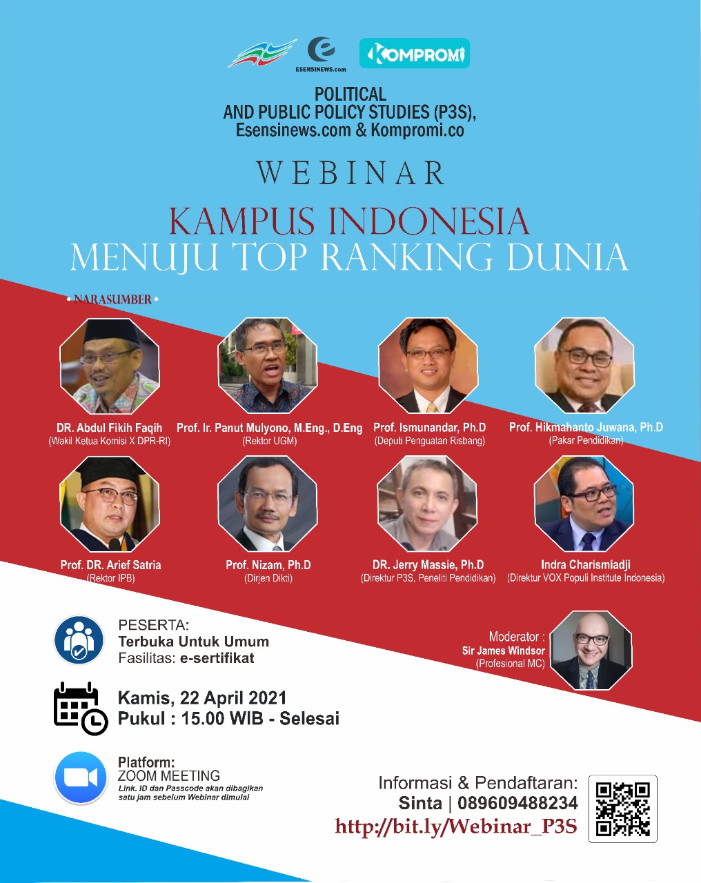 “Marilah kita dukung pemeintahan Jokowi dan kita support agar kampus-kampus di Indonesia bisa masuk top 100 bahkan top 50, ini butuh kerja keras. Nah semua akan dikupas dalam webinar P3S,” Jelas Jerry. (JK)