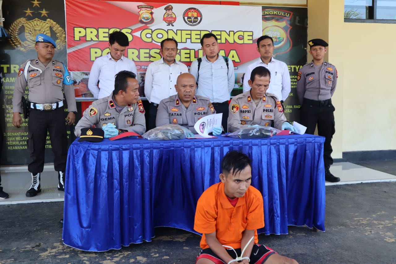 Kapolres Seluma Polda Bengkulu AKBP Arif Eko Prasetyo melalui Wakapolres Kompol Tatar Insani, didampingi Kasi Humas Iptu Noprizal dan Kapolsek Semidang Alas Ipda Gema saat press release di Mapolres Seluma, Senin (15/5/2023) mengatakan, terduga pelaku ditangkap pada Jumat (12/5/2023) malam saat berada di Desa Padang Kedondong Kecamatan Kota Manna Kabupaten Bengkulu Selatan.