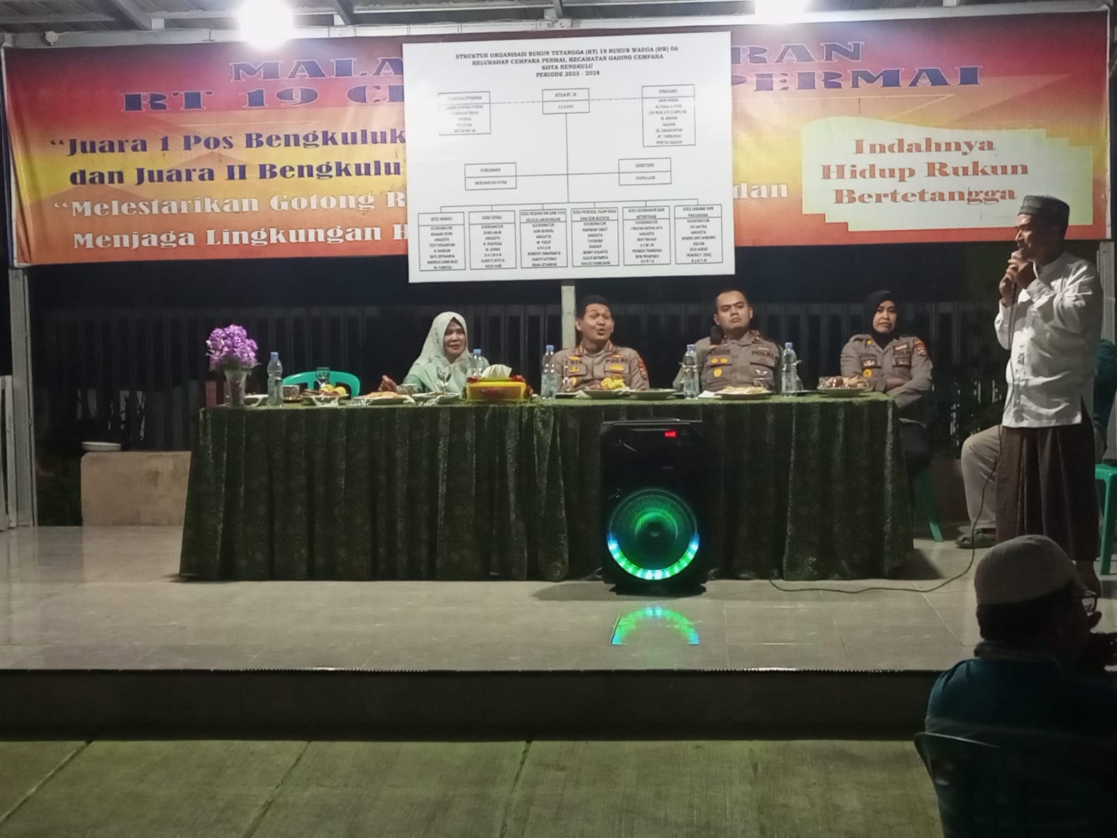 Kegiatan kunjungan tersebut dilaksanakan di Pos Kamling Jalan Rangkong RT 19 RW 06 Kelurahan Cempaka Permai Kecamatan Gading Cempaka Kota Bengkulu, dan dihadiri oleh Kapolsek Gading Cempaka, Kasat Binmas, Lurah Cempaka Permai, Ketua RT, Ketua RW, Linmas, dan warga setempat.