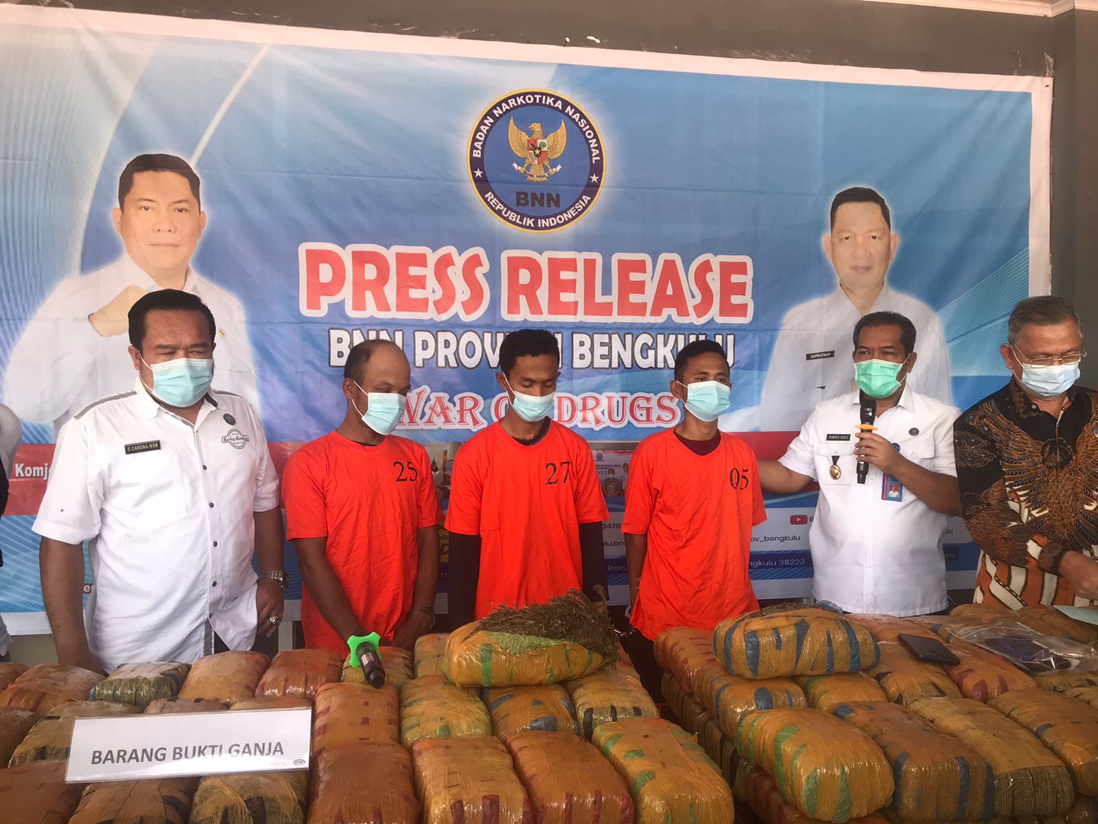 “5 karung besar berisi 25 bal ganja, dan 1 karung berisi 18 bal ganja,” terang Kepala BNNP Bengkulu Supratman SH kepada wartawan di kantor BNNP Bengkulu, Sabtu (16/10/2021).