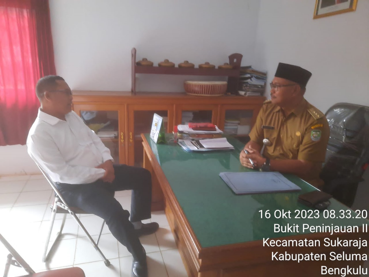 Seluma – Senin (16/10/2023) sekira pukul 09.30 WIB s/d selesai, Kanit Intel Polsek Sukaraja Polres Seluma Polda Bengkulu Ipda Sumarno, bersama Personel Polsek dan Bhabinkamtibmas Kelurahan Sukaraja melaksanakan silaturahmi sekaligus perkenalan dan penggalangan kepada Camat Sukaraja, terkait perkembangan situasi di Kelurahan Sukaraja pasca pertemuan penyampaian aspirasi yang dilakukan perwakilan RW, RT dan LPM Kelurahan Sukaraja di Kantor Camat Sukaraja.