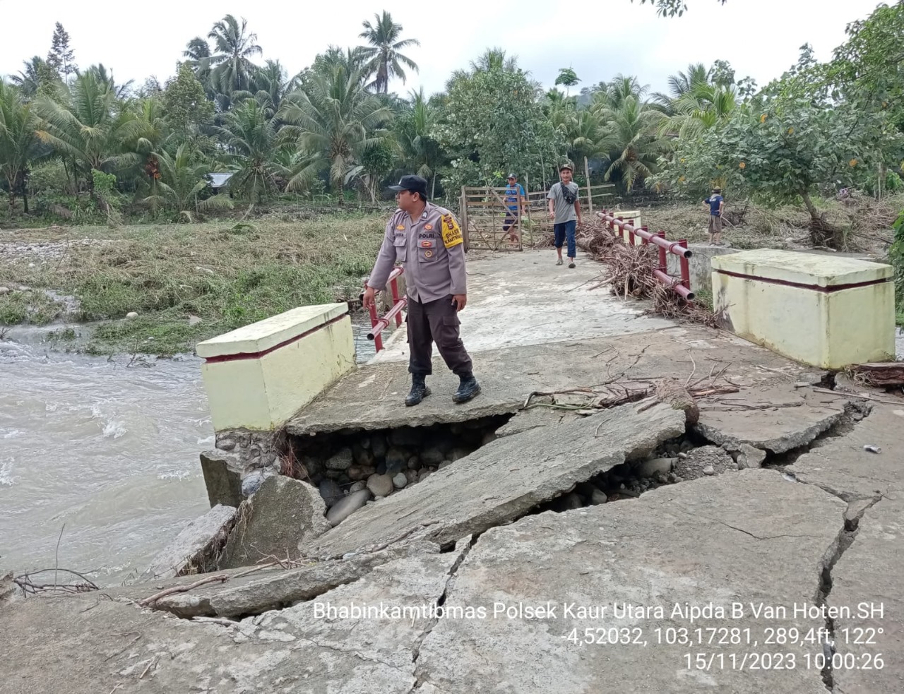 Kaur – Pasca hujan deras yang melanda Kabupaten Kaur, Personel Polsek Kaur Utara Polres Kaur Polda Bengkulu melakukan monitoring pengecekan di beberapa titik wilayah yang mengalamai kerusakan, Rabu (15/11/2023).